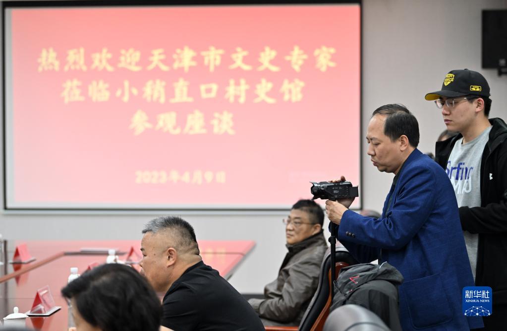 在天津市西青區小稍直口村史館,謝連華手拿攝像機記錄專家發言(4月9日攝)。