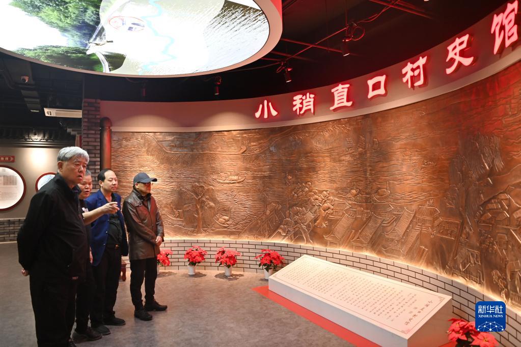 謝連華(右二)在天津市西青區小稍直口村史館參觀(4月9日攝)。