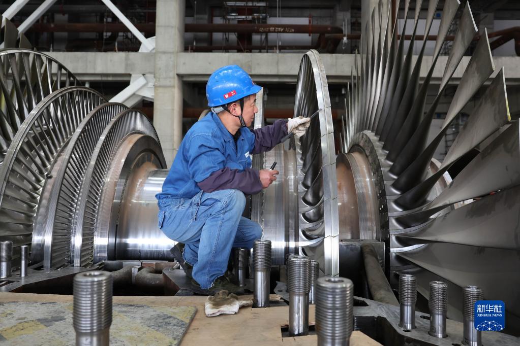 4月13日,一名工人在江蘇省射陽縣射陽港電廠四期百萬千瓦燃煤發電機組1號汽輪機組設備安裝現場工作。