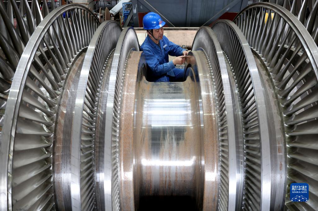 4月13日,一名工人在江蘇省射陽縣射陽港電廠四期百萬千瓦燃煤發電機組1號汽輪機組設備安裝現場工作。