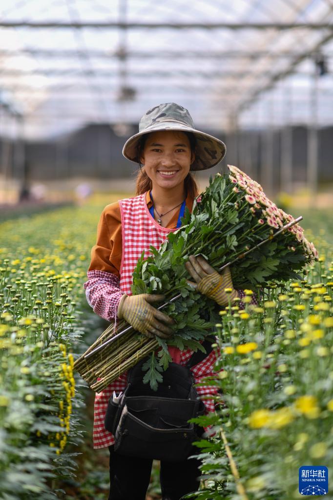 云南省開遠市的花農項麗珍在展示采摘的鮮花(3月22日攝)。