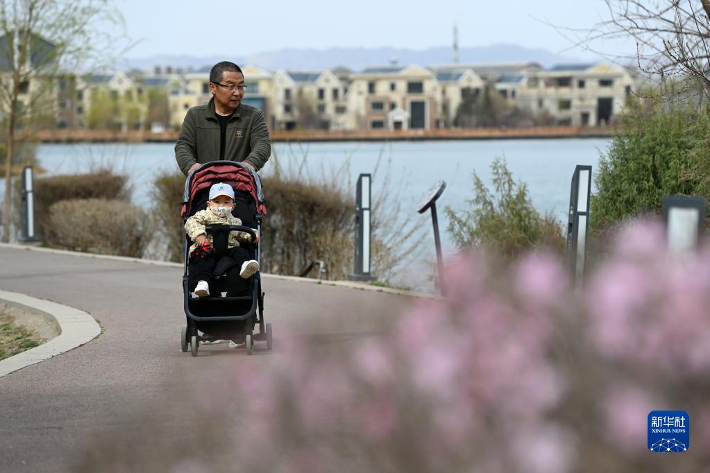 4月13日,市民在張掖市蘆水灣生態景區內休閑散步。
