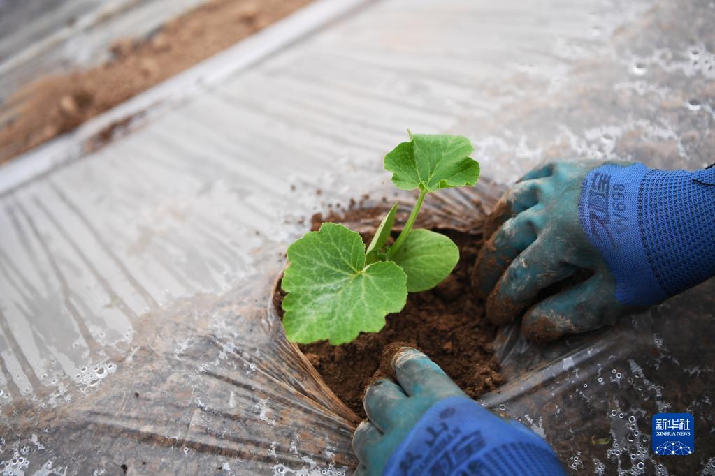 4月13日,在崇信縣錦屏鎮東莊村新豐園蔬菜生產基地的大棚里,農民在栽種蔬菜秧苗。