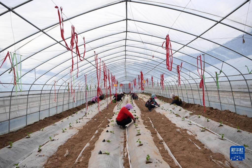 4月13日,在崇信縣錦屏鎮東莊村新豐園蔬菜生產基地的大棚里,農民在栽種蔬菜秧苗。