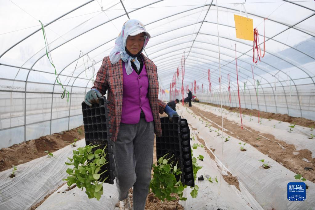4月13日,在崇信縣錦屏鎮東莊村新豐園蔬菜生產基地的大棚里,農民在搬運蔬菜秧苗。