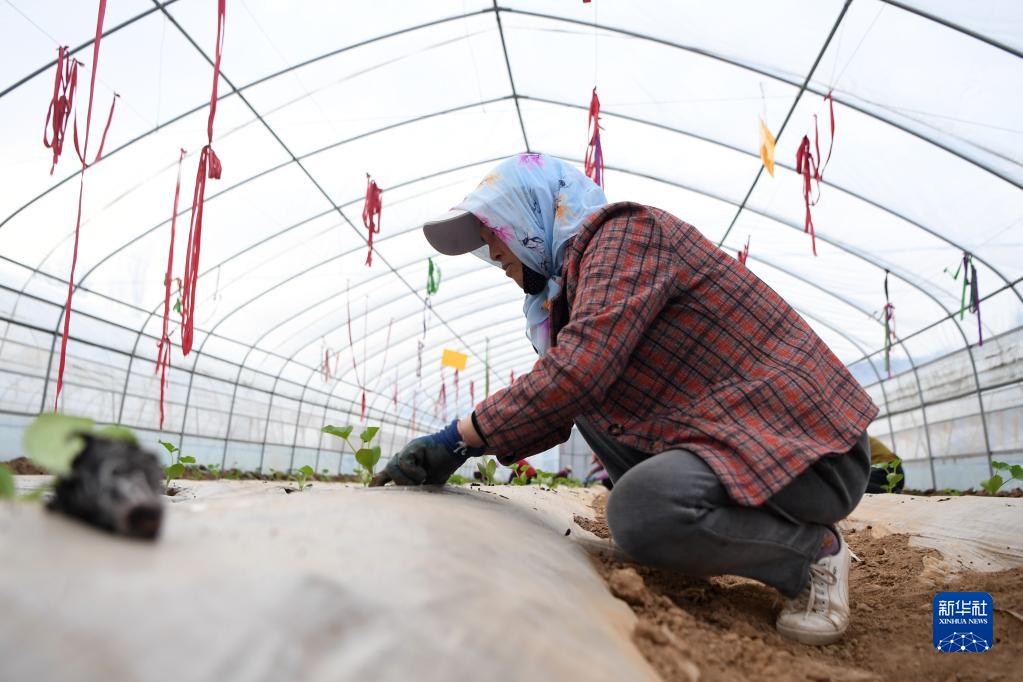 4月13日,在崇信縣錦屏鎮東莊村新豐園蔬菜生產基地的大棚里,農民在栽種蔬菜秧苗。
