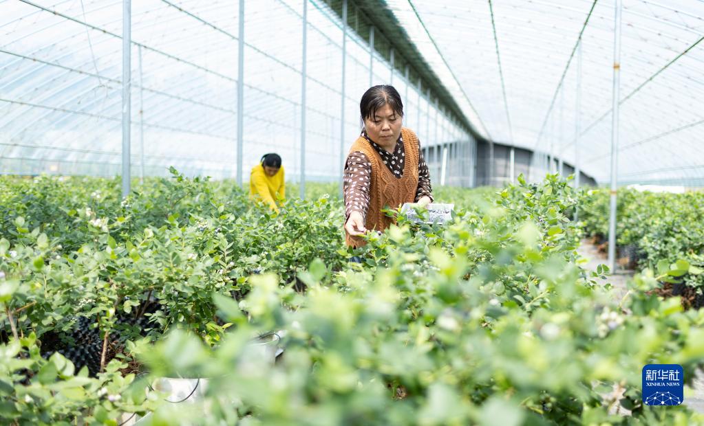 4月13日,山東省臨沂市臨沭縣大興鎮一處藍莓種植大棚內,農民在采摘藍莓。