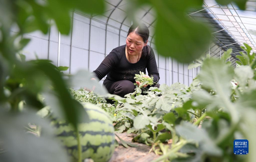 4月13日,農民在山東省臨沂市臨沭縣大興鎮一處西瓜種植大棚內進行田間管理。