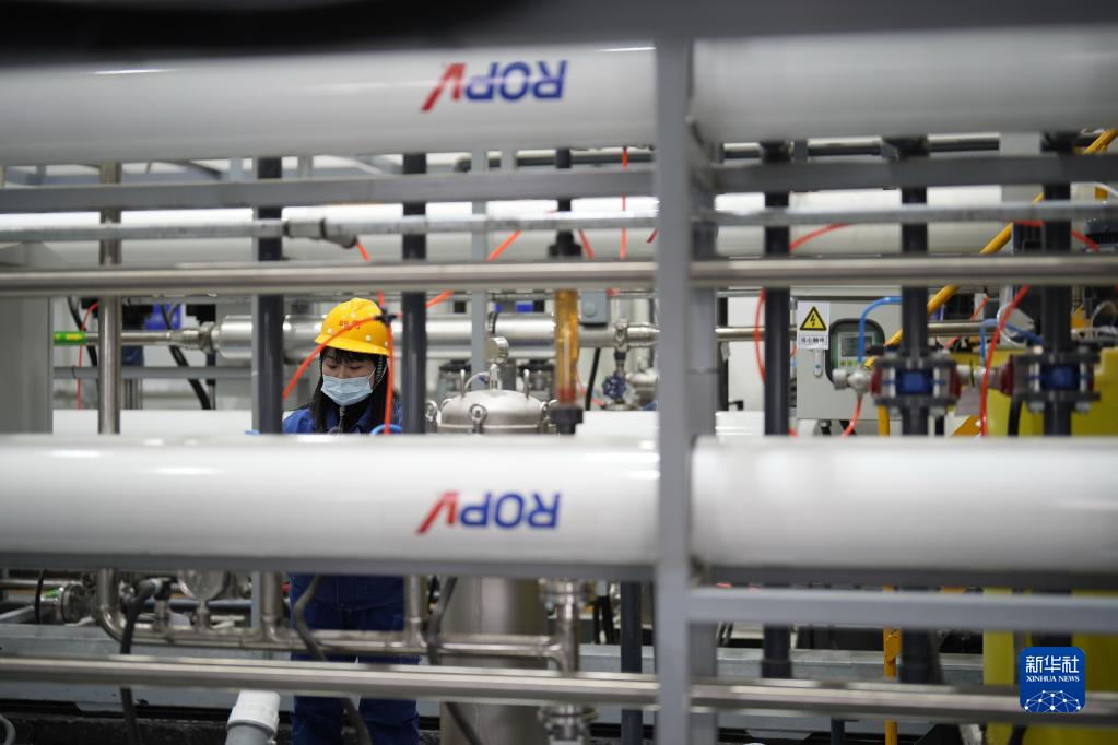 4月13日,工作人員在唐山冀東啟新水泥有限責任公司滲液處理站內查看水凈化設備運行情況。該處理站可將生活垃圾產生的滲濾液經處理后轉化為工業用水。