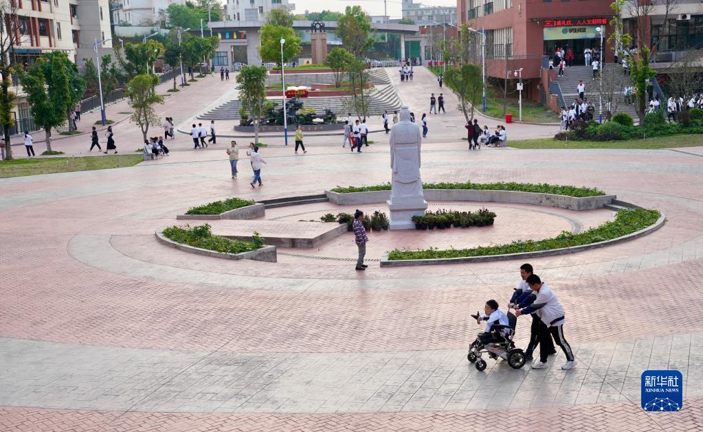 4月12日,朱金祥和同學推著坐在輪椅上的鐘華強在校園內散步。