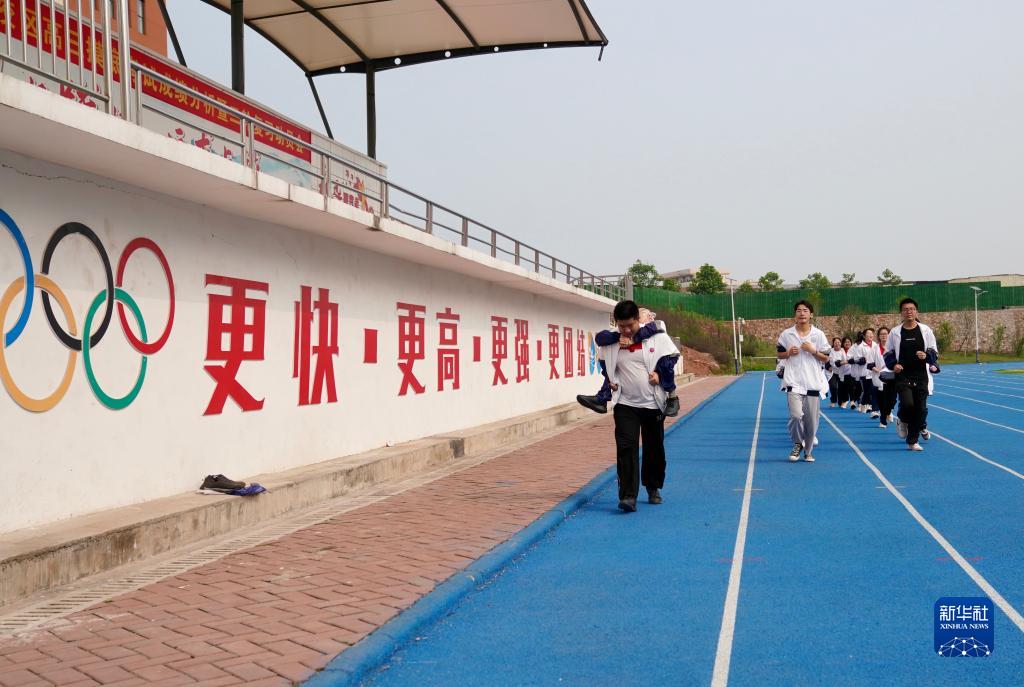 4月13日,朱金祥(左)背著鐘華強在體育課上慢跑。