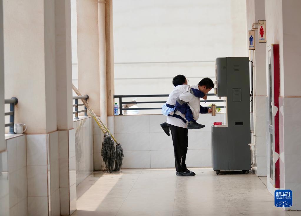 鐘華強患有先天性腦癱,雙腿無法正常行走。進出教室、校園散步、上下樓梯、打水,上體育課……10年時間,朱金祥一直充當著鐘華強的“腿腳”,背著他一起長大,成績優異的鐘華強在學習上也常常幫助朱金祥。