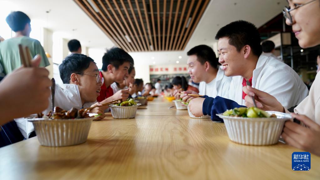 4月13日,朱金祥(右二)和鐘華強(左一)在食堂吃飯。