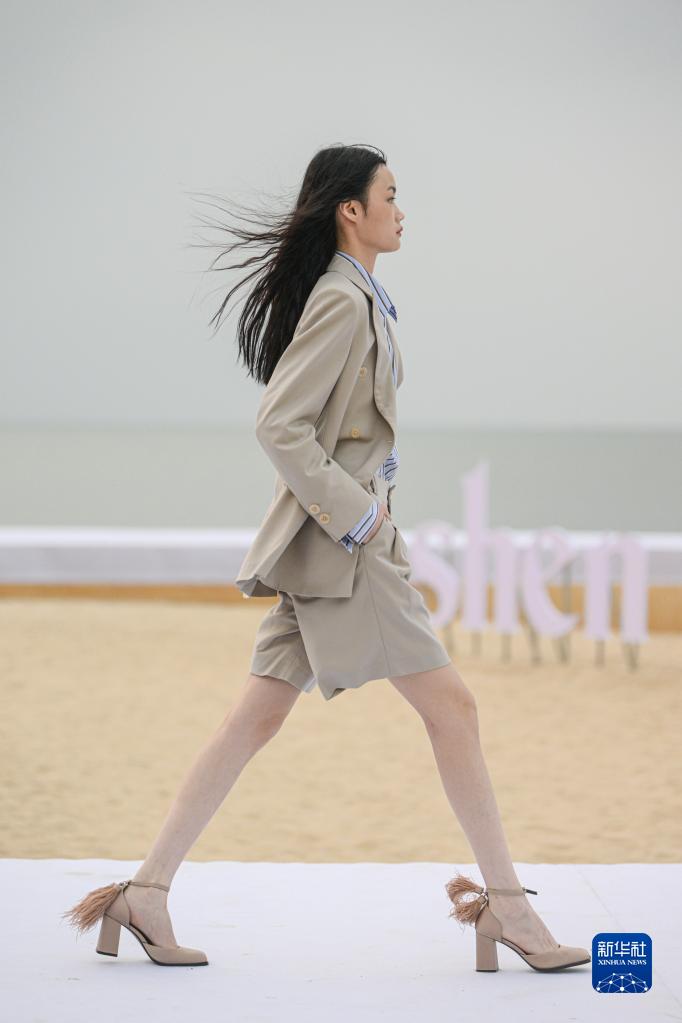 4月13日,模特在消博會時裝周海邊秀場展示時裝作品。