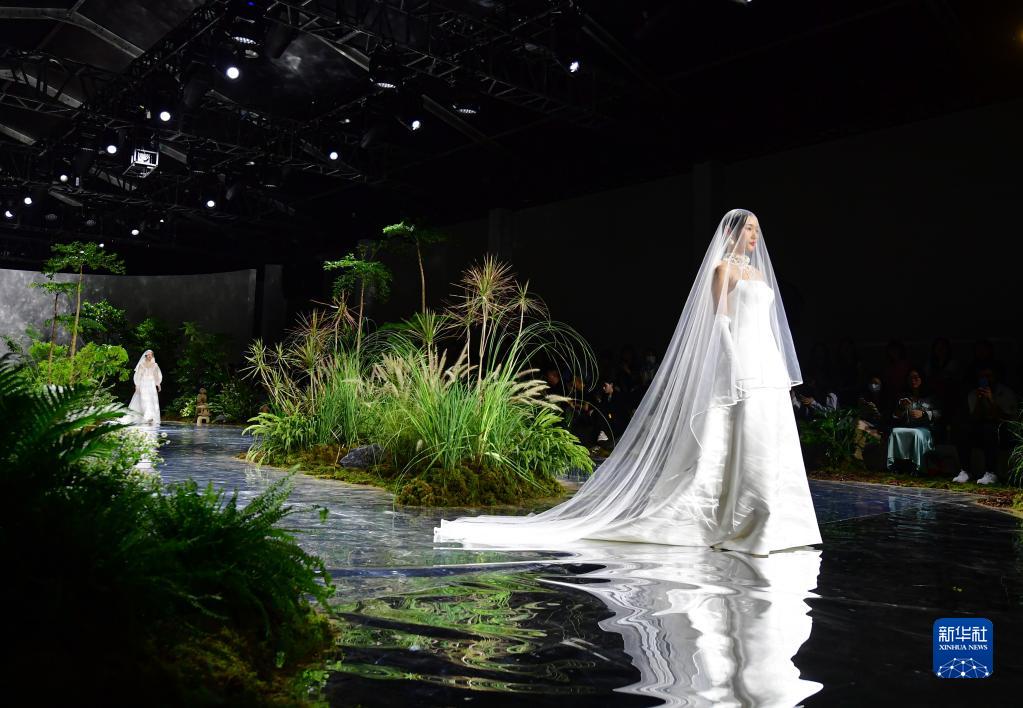 4月14日,模特在消博會時裝周主秀場展示時裝作品。