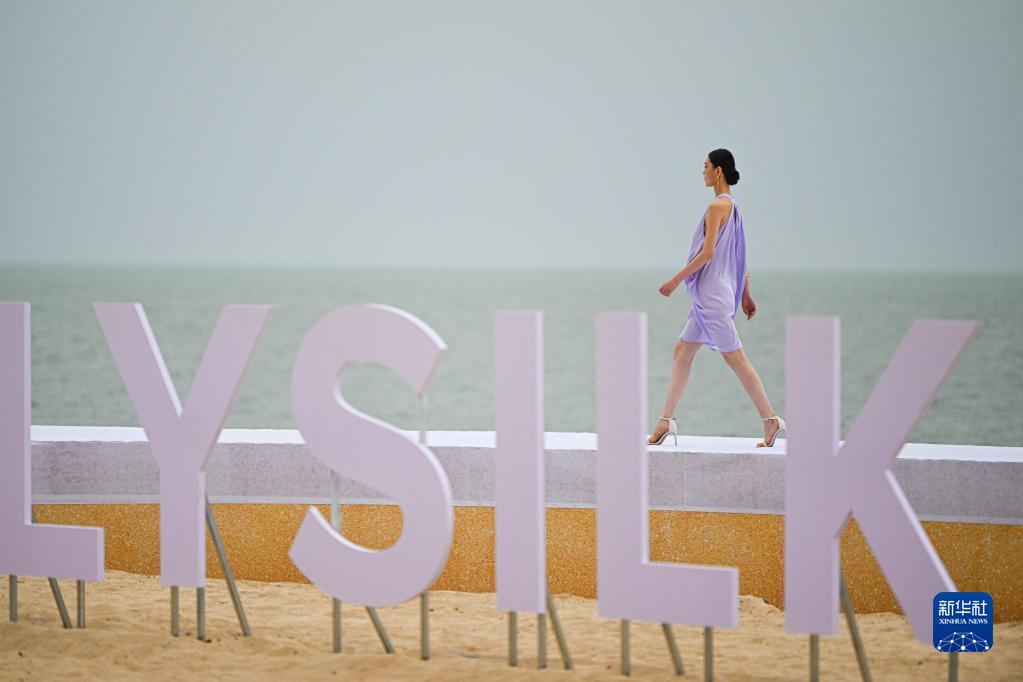 4月12日,模特在消博會時裝周海邊秀場展示時裝作品。