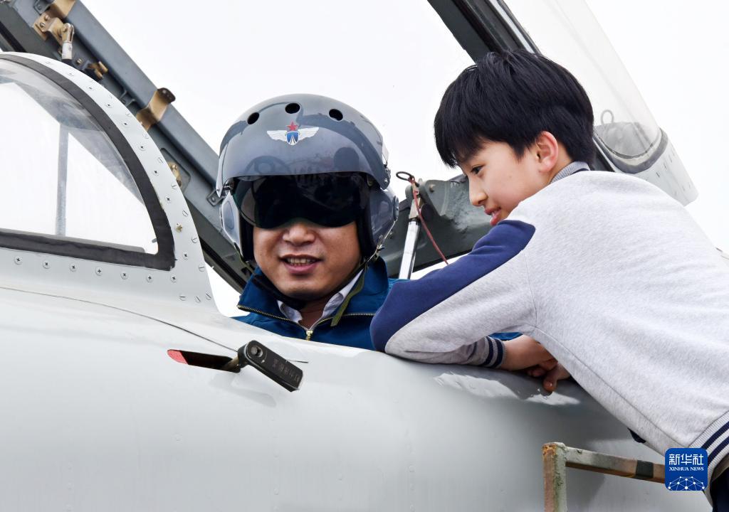 4月14日,一名參加研學活動的男孩(右)與青島海洋軍事博物館工作人員交流。