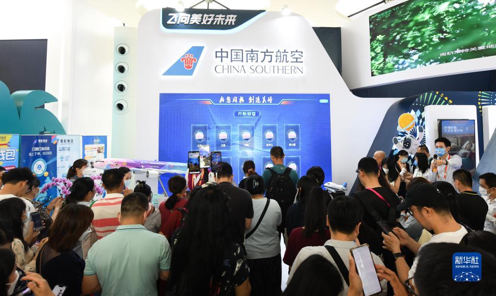 4月14日,觀眾在中國南方航空展臺體驗互動游戲。