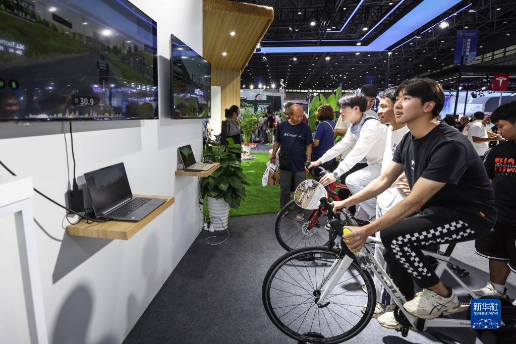 4月14日,觀眾在消博會現場體驗智能騎行。