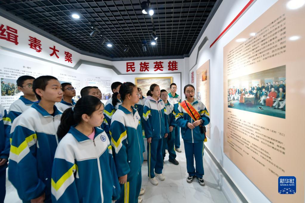 4月14日,在張掖市禁毒教育基地,學生們參觀展覽。