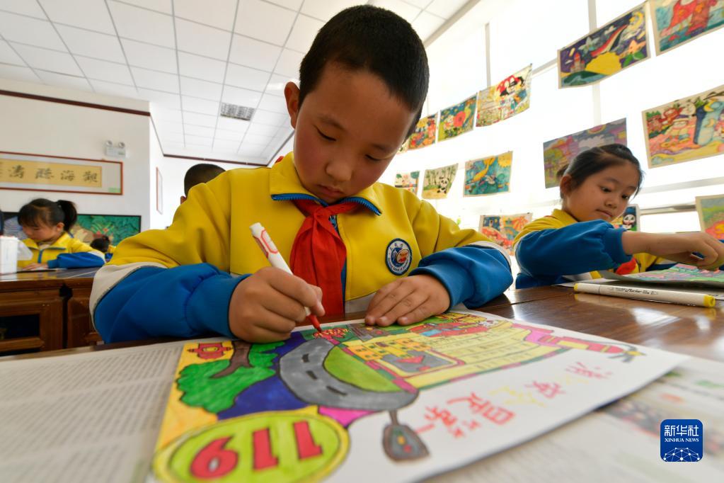 4月14日,在張掖市甘州區大成學校,學生創作國家安全教育相關的手抄報。