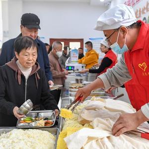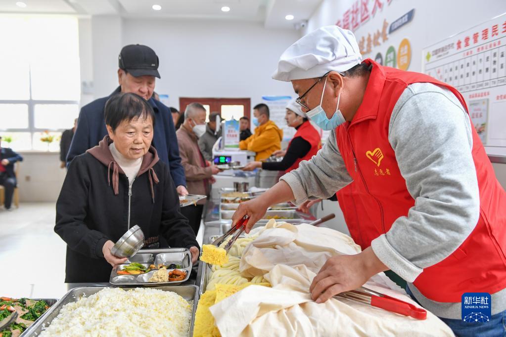 4月14日,在吉林省四平市梨樹縣幸福社區食堂,志愿者為老人盛菜。該食堂是吉林省民政廳重點支持的100個社區老年食堂之一。