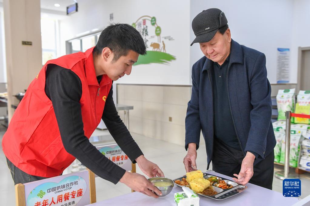 4月14日,在吉林省四平市梨樹縣幸福社區食堂,志愿者為老人端菜。該食堂是吉林省民政廳重點支持的100個社區老年食堂之一。