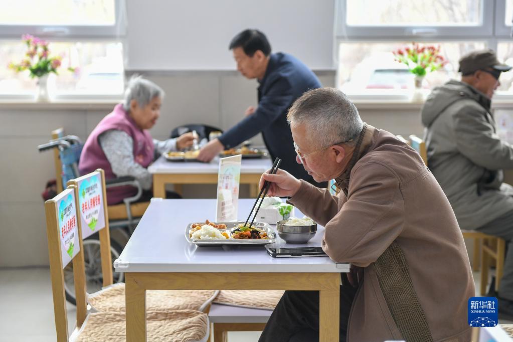 4月14日,老人在吉林省四平市梨樹縣幸福社區食堂就餐。該食堂是吉林省民政廳重點支持的100個社區老年食堂之一。