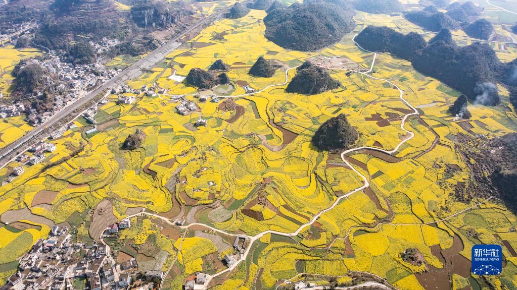 貴州省六盤水市六枝特區木崗鎮抵簸村的油菜花田(3月9日攝,無人機照片)。