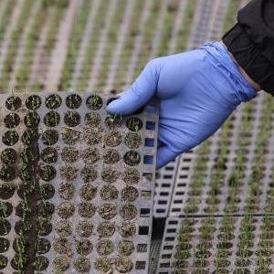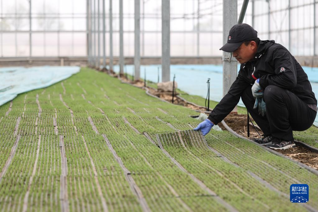 4月14日,盤錦市盤山縣的農戶在查看水稻秧苗的育苗情況。