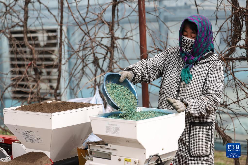 4月14日,盤錦市盤山縣的農戶在進行水稻秧苗育苗工作。