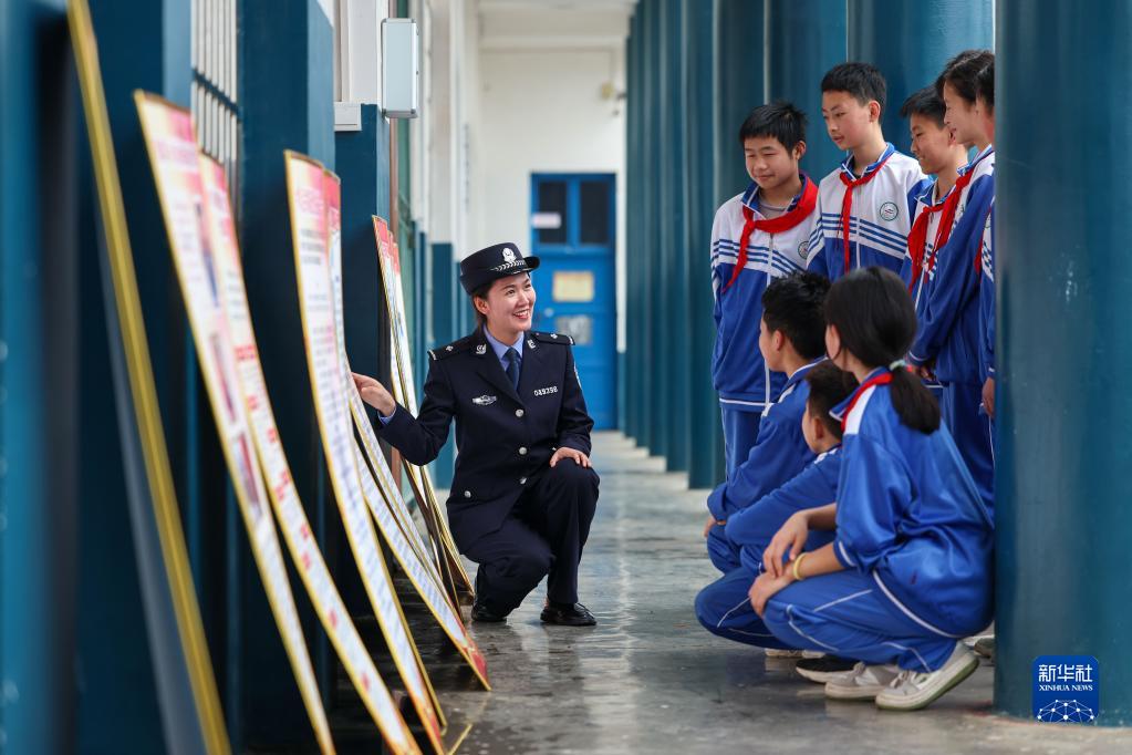 4月14日,在貴州省黔東南苗族侗族自治州丹寨縣興仁鎮中學,民警李嘉怡為學生講解校園反恐防暴知識。