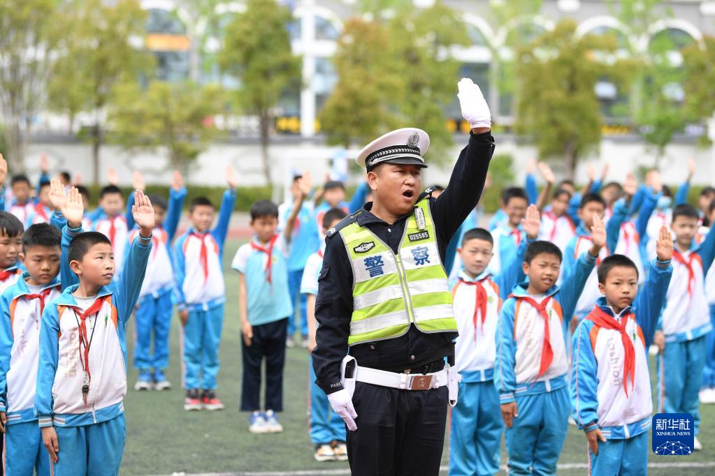 4月14日,民警在貴州省遵義市余慶縣城關一小帶領學生們學習交通指揮手勢。
