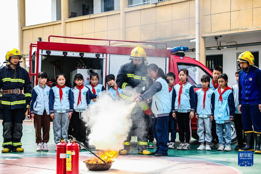 4月13日,在江西省撫州市南豐縣傅坊鄉中心小學,消防員為學生示范滅火器的使用方法。