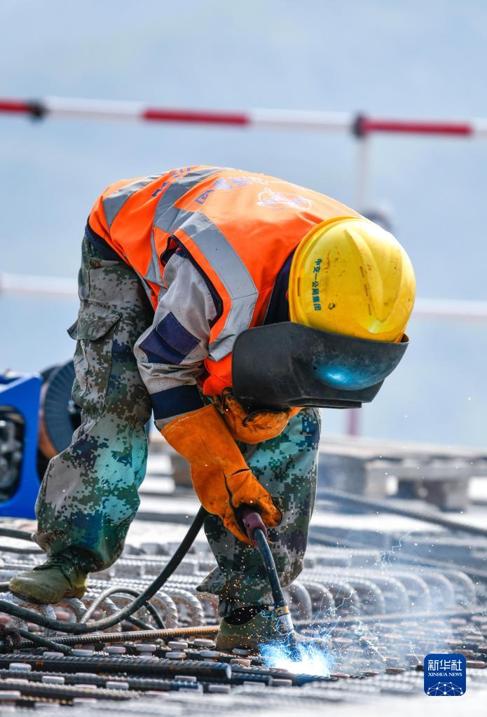 4月11日,工人在貴州德余高速烏江特大橋上施工。