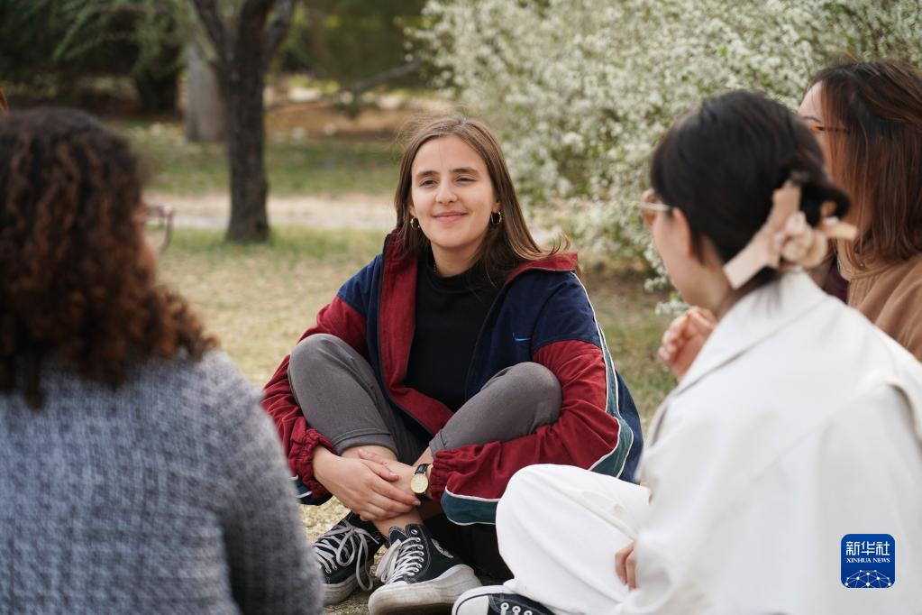 3月31日,微微(左二)在北京大學與同學們交流。