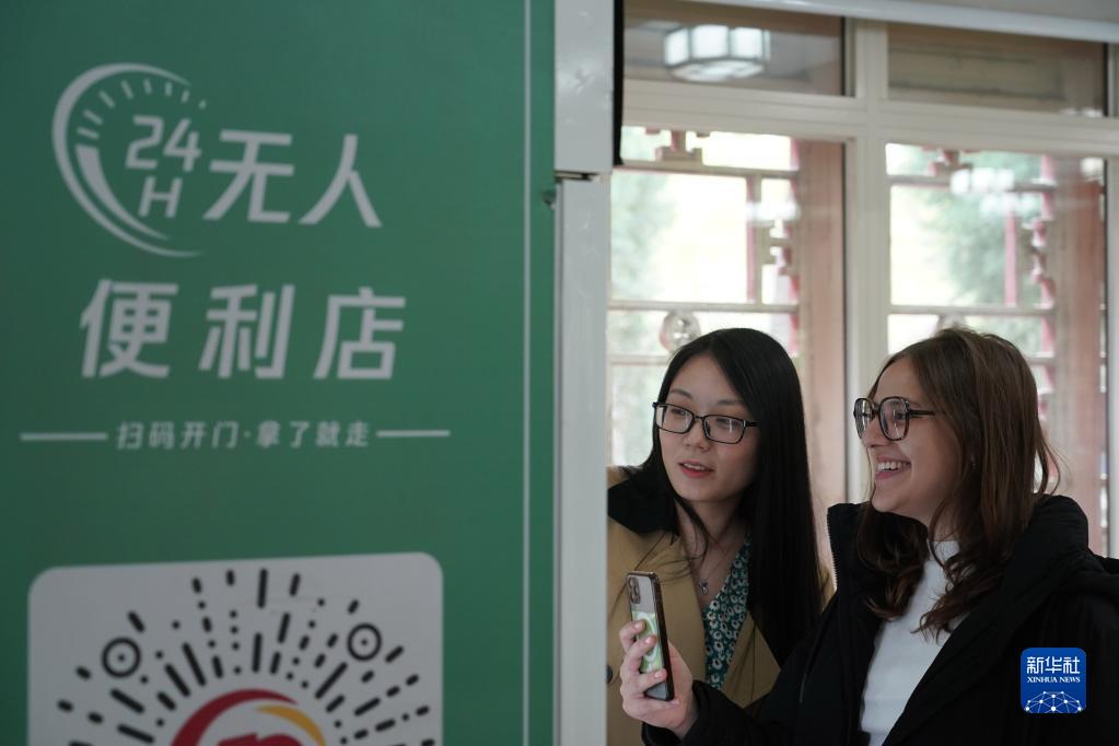 4月13日,微微(右)在北京大學燕京學堂,掃碼購買商品。