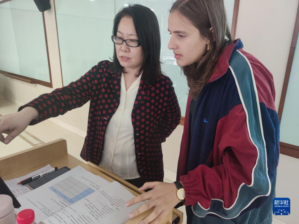3月31日,在北京大學,微微(右)在中文課后與老師交流(手機照片)。