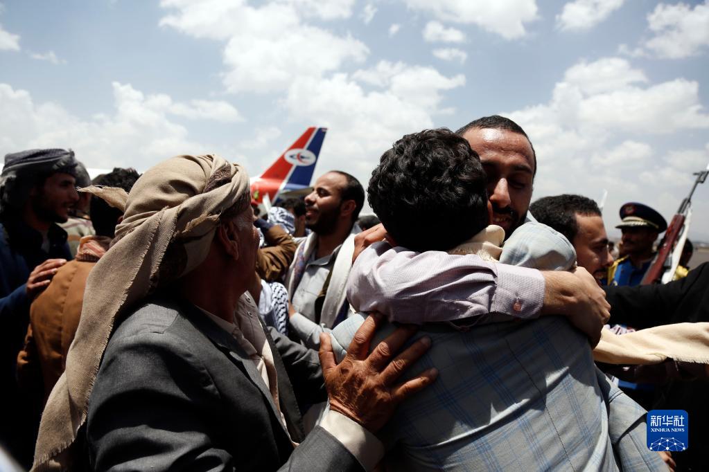 4月14日,在也門薩那機場,獲釋胡塞武裝成員戰俘下飛機后與家人擁抱。