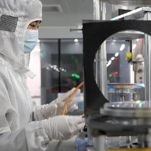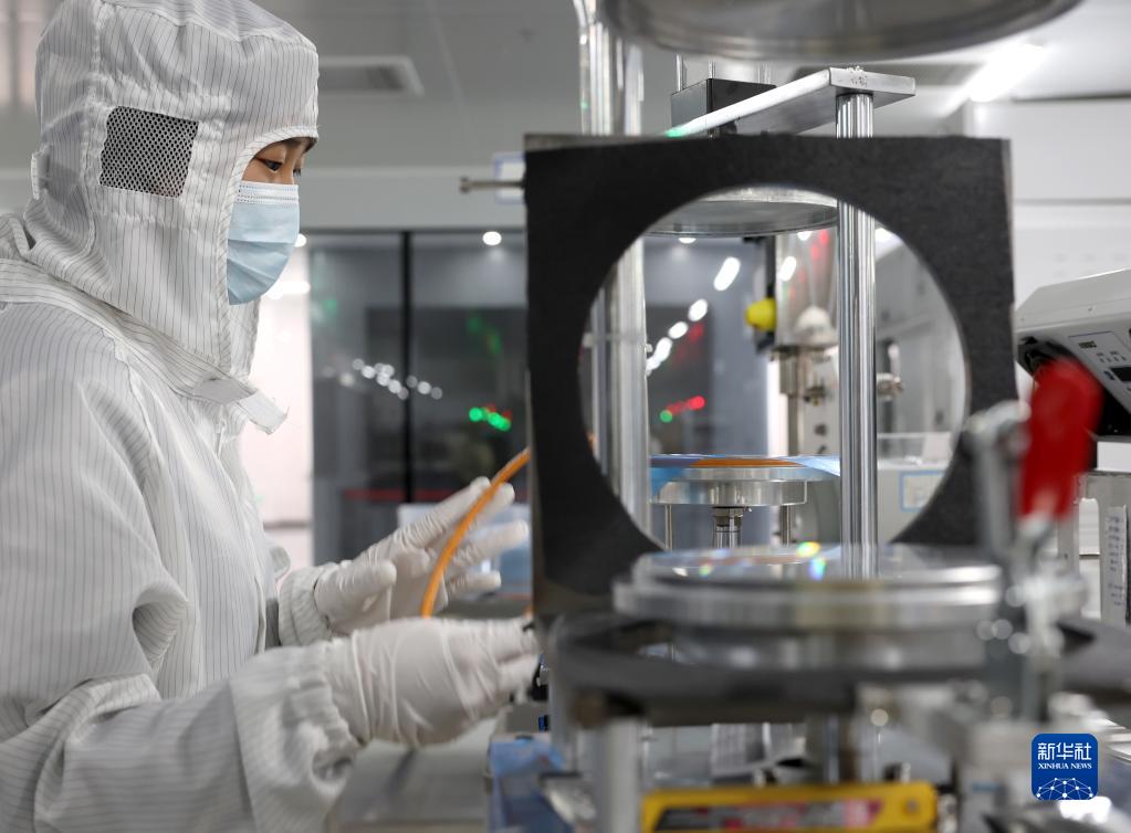 4月14日,一位工人在江蘇省射陽縣江蘇暖陽半導體科技公司LED芯片生產車間工作。