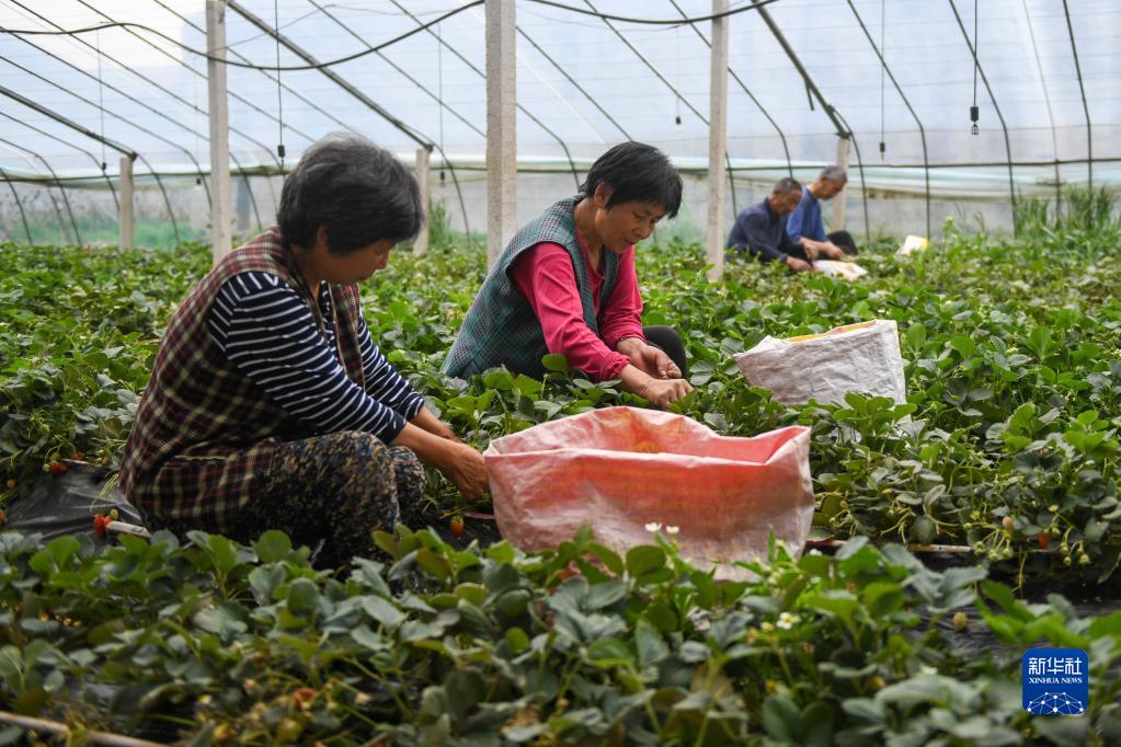 4月14日,山東省泰安市岱岳區范鎮鄭寨子村農業合作社社員在水果大棚內采摘草莓。
