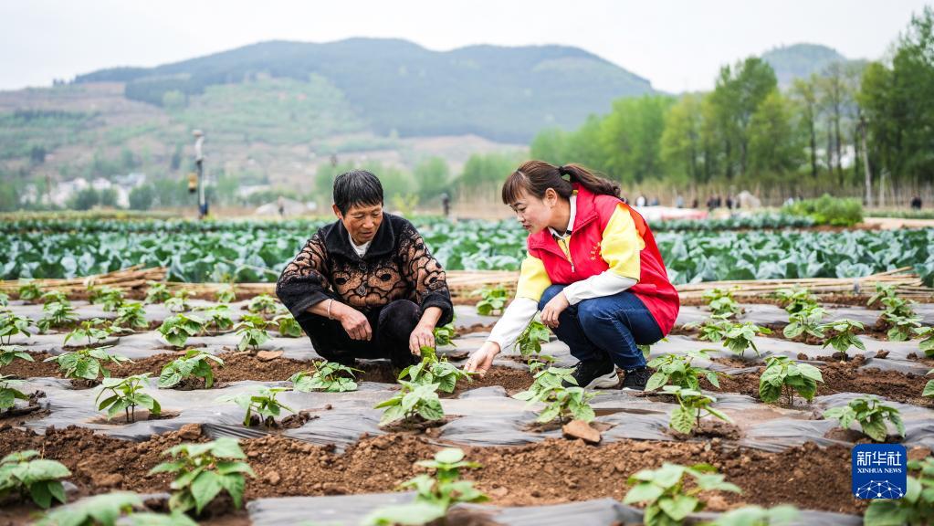 4月14日,農技工作者在六盤水市鐘山區大河鎮大橋村和村民交流蔬菜種植技術。