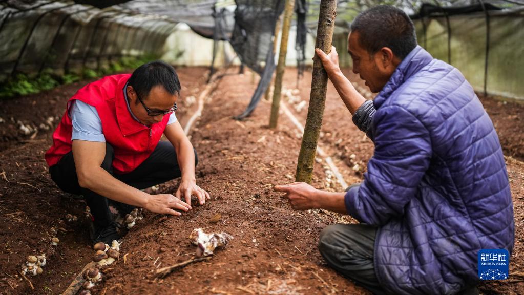 4月14日,農技工作者在六盤水市鐘山區汪家寨鎮那羅村查看皺環球蓋菇的種植情況。