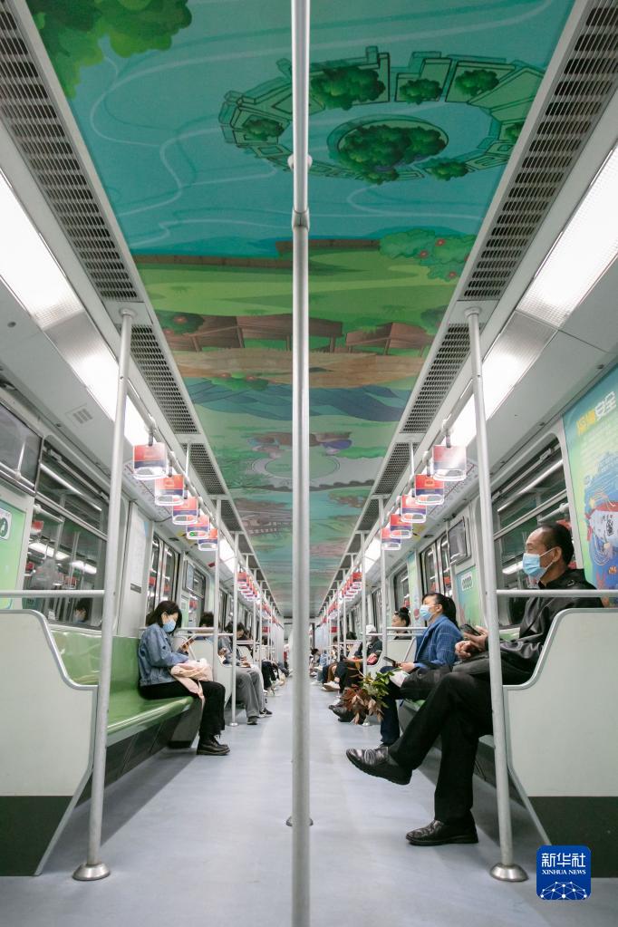 這是4月15日拍攝的上海地鐵“國安號”主題列車車廂內景,車廂內外以主題海報等形式宣傳國家安全知識。