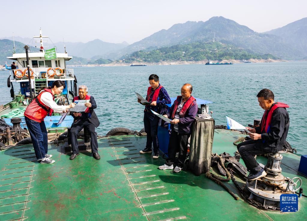 4月15日,湖北省宜昌市生態環境局秭歸縣分局工作人員在秭歸港??康拇吧?,為船員發放宣傳單,講解生態環保相關法律知識。