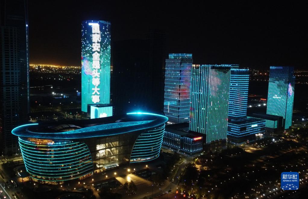 天津市濱海新區中心商務區部分樓宇為全民國家安全教育日亮燈(4月14日攝,無人機照片)。