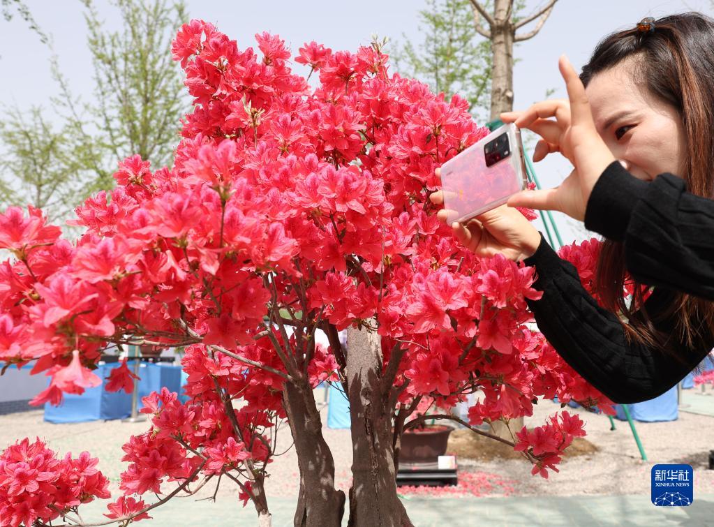 4月15日,觀眾在展區拍攝展出的盆景。