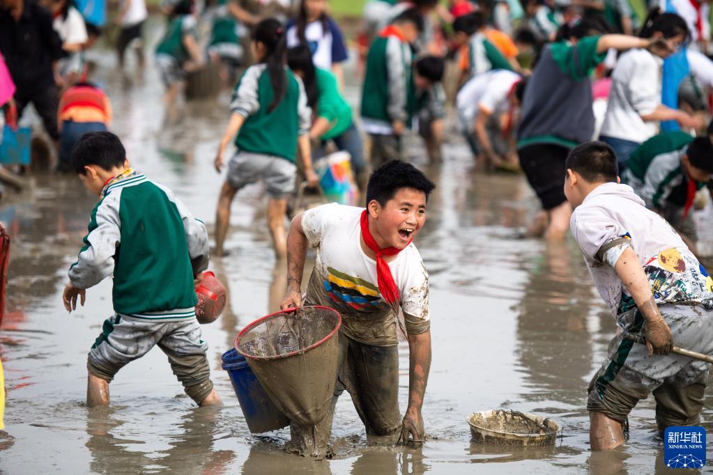 當日,在湖南省長沙市寧鄉市灰湯鎮花果山村舉行的農耕民俗文化節學生研學活動中,孩子們通過開展稻田插秧、捉泥鰍等“農趣” 比賽,走進田間地頭,感受勞動帶來的艱辛與快樂。