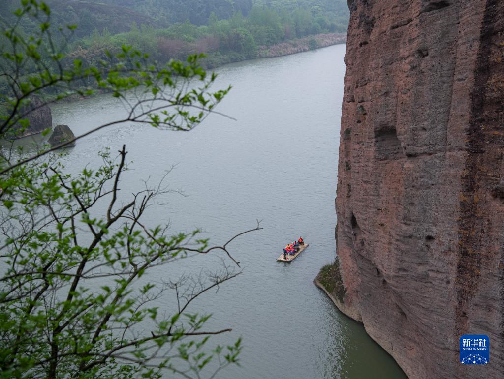 4月13日,游客乘竹筏在江西省鷹潭市龍虎山風景區游覽。
