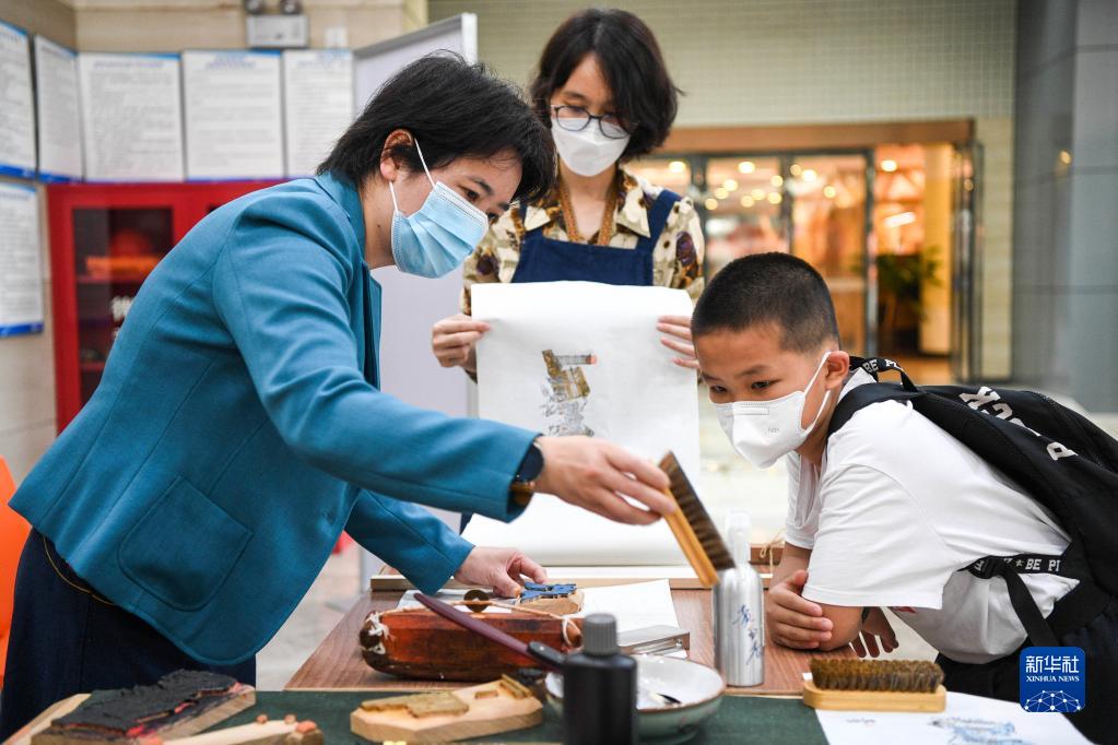 4月15日,在廣西壯族自治區圖書館,黃玉杏(左)給小讀者講解古籍印刷的有關知識。
